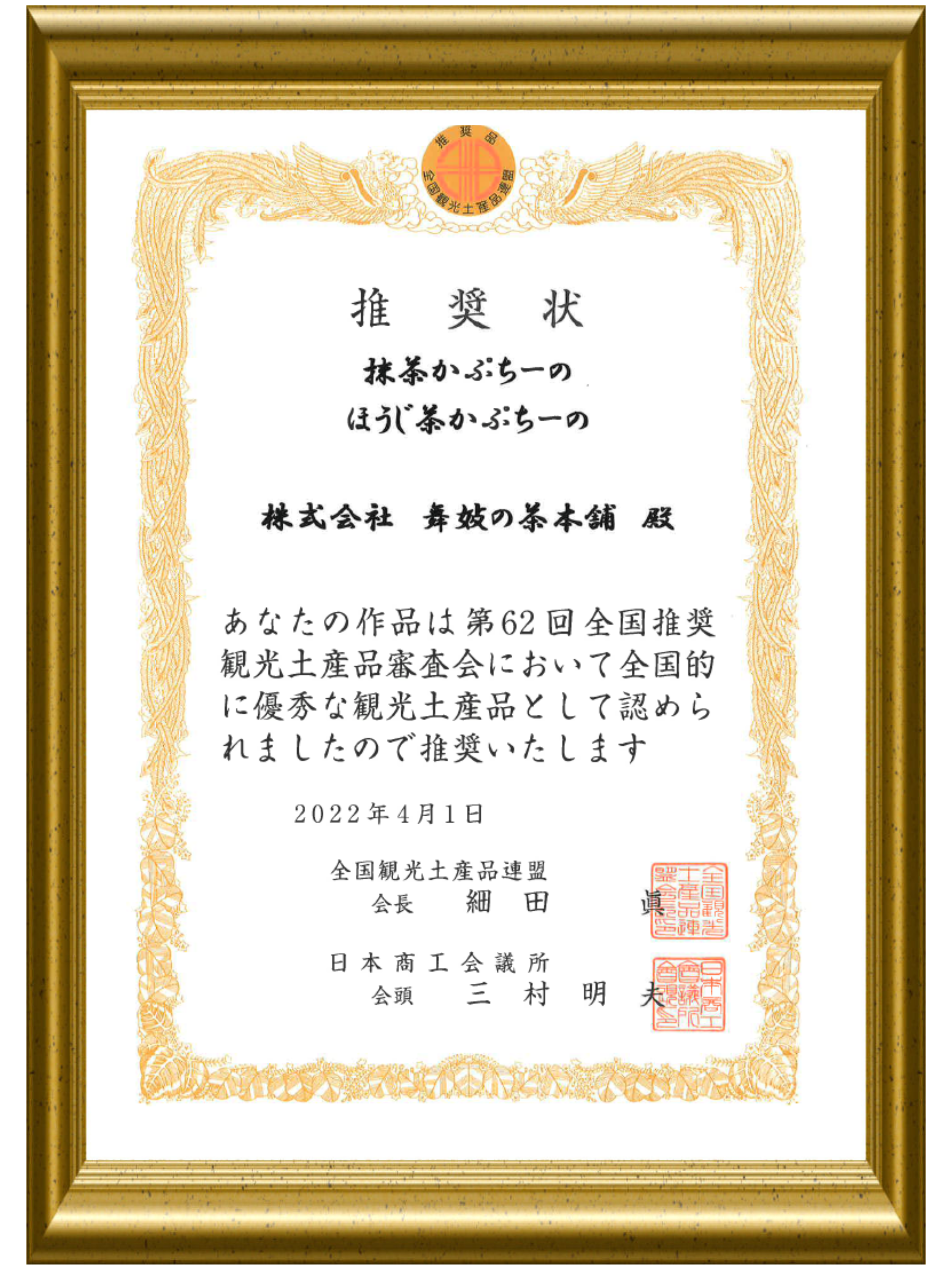 第62回全国推奨観光土産品審査会にて抹茶かぷちーの、ほうじ茶かぷちーのが優秀な観光土産品として認定されました!