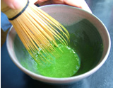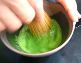 そして、茶せんを使い泡点てます。茶せんの先を、抹茶碗の底につけずに、英文字の「m」の字を描くように、茶せんの手で持つところを固定し、手首のスナップを使い、すばやく泡点てます。