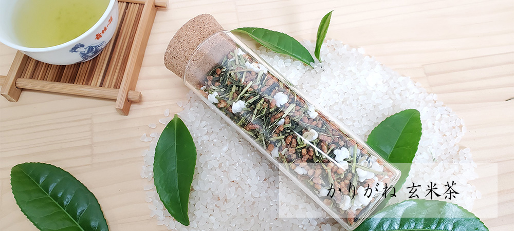香りを楽しむお茶として、こんがりと炒った玄米(げんまい)を玉露・煎茶の製造過程に出た、かりがね(茎茶)に加え、さっぱりとした味に仕上げたのが「かりがね 玄米茶」です。