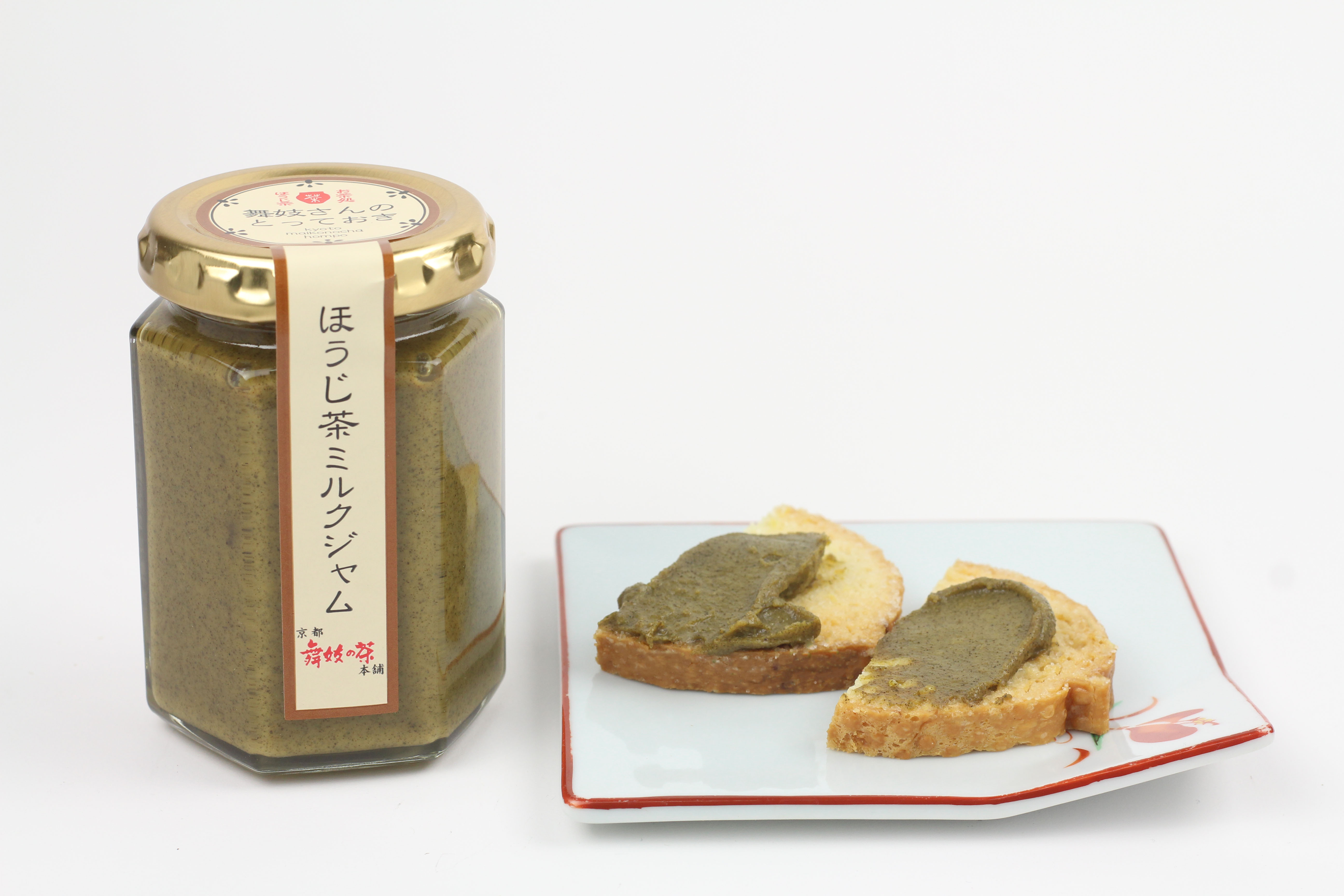 舞妓さんのとっておき「ほうじ茶ミルクジャム」は、濃厚な北海道のミルクに、生クリーム、甜菜糖に香り豊かなほうじ茶を加えたミルクコンフィチュール(ミルクジャム)です。