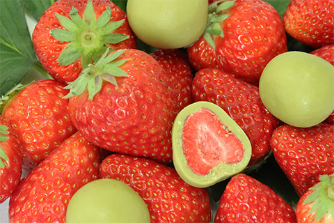 甘酸っぱい丸ごとフリーズドライのいちごに、石臼挽き宇治抹茶を贅沢に使用した濃厚な抹茶チョコレートでコーティング。