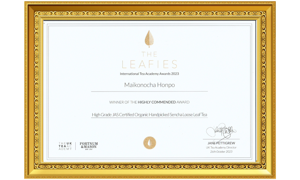 イギリスで行われました国際的なお茶のコンテスト、リーフィーズ国際ティーアカデミー賞2023で有機栽培手摘み煎茶金印が優秀賞を受賞致しました!