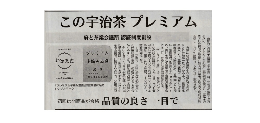 宇治茶の販路を広げるため、京都府と京都府茶会議所は「プレミアム玉露」 認定制度を設け、16業者44商品が認定され、舞妓の茶本舗も「玉露・屋敷の茶」 「玉露・匠」「玉露・山下印」が認定され、掲載されました。