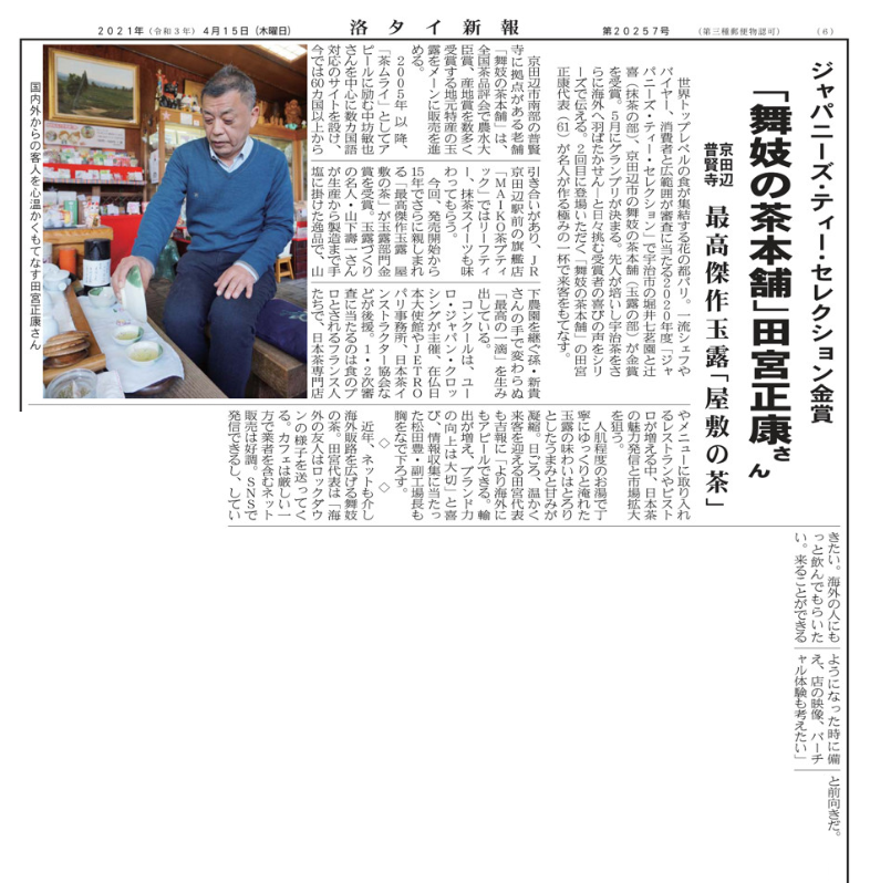 2020年度「JAPANESE TEA SELCTION」にて屋敷の茶が金賞に輝いた記事が地元紙、洛タイ新報に記載されました!