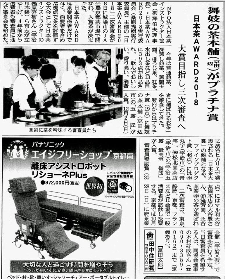 日本茶アワード2018で舞妓の茶本舗の玉露「匠」がプラチナ賞を受賞した記事が記載されました。