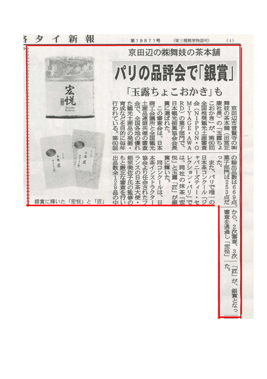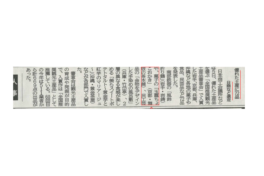 2019/12全国推奨観光土産品審査会にて「玉露ちょこおかき」が日本観光振興協会会長賞受賞記事が京都新聞に記載されました!