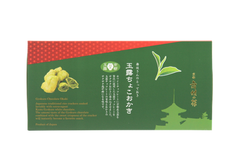 ホワイトチョレートに、京都産の玉露を贅沢に使用した玉露チョコレートをサクサクおかきに染み込ませました。玉露チョコレートの旨味とおかきのサクサク感が癖になる味です。